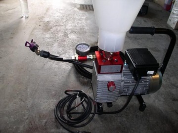 Zařízení pracuje pomocí elektrického motoru, na kterém je umístněn excentr pohánějící píst, který při každém pohybu dopravuje olej do membrány. Membrána uváděná takto do činnosti nasává produkt prostřednictvím sacího ventilu a stlačováním ho dostává z pistole příslušným otvorem v trysce stříkací pistole.